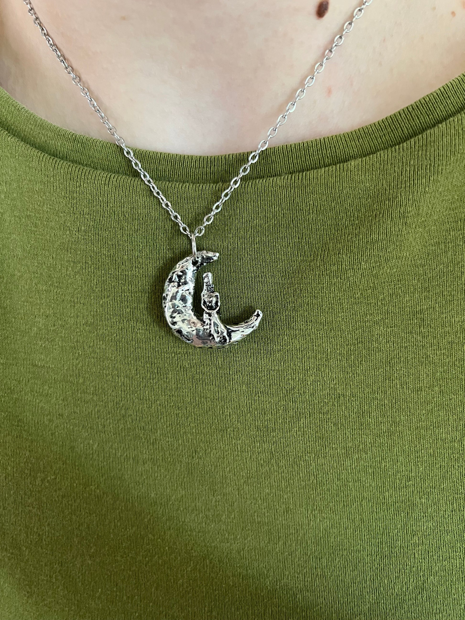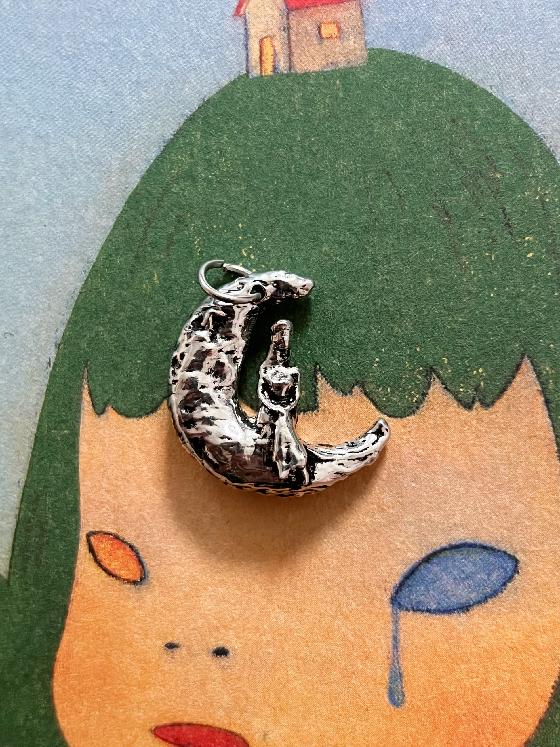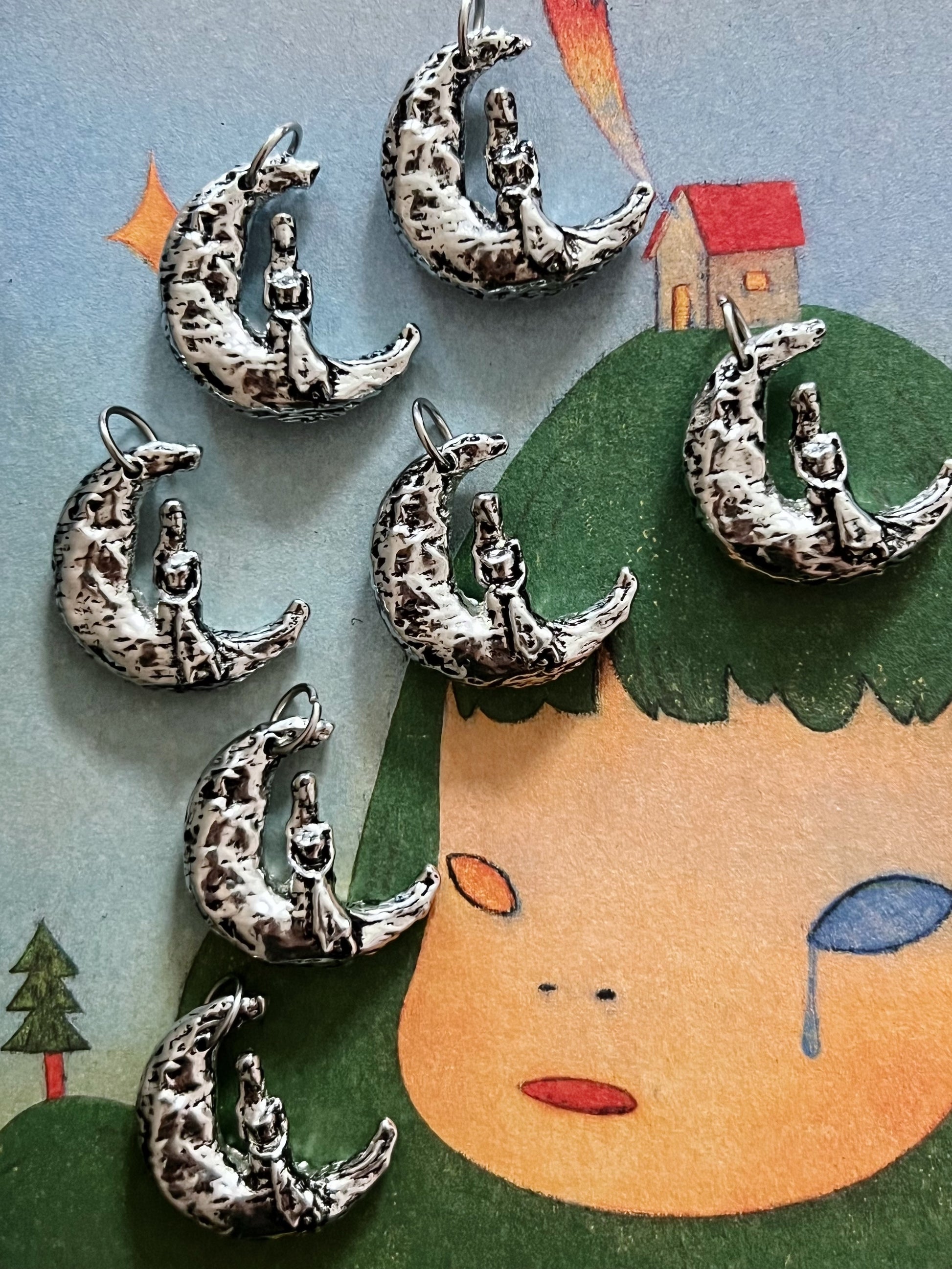 fully handmade! a girl on the moon!! the pendent is made from lead free solder and the chain is 16 inch stainless steel! the black may slight come off over time if constantly exposed to water! Due to the handmade nature your piece might have slight differences!