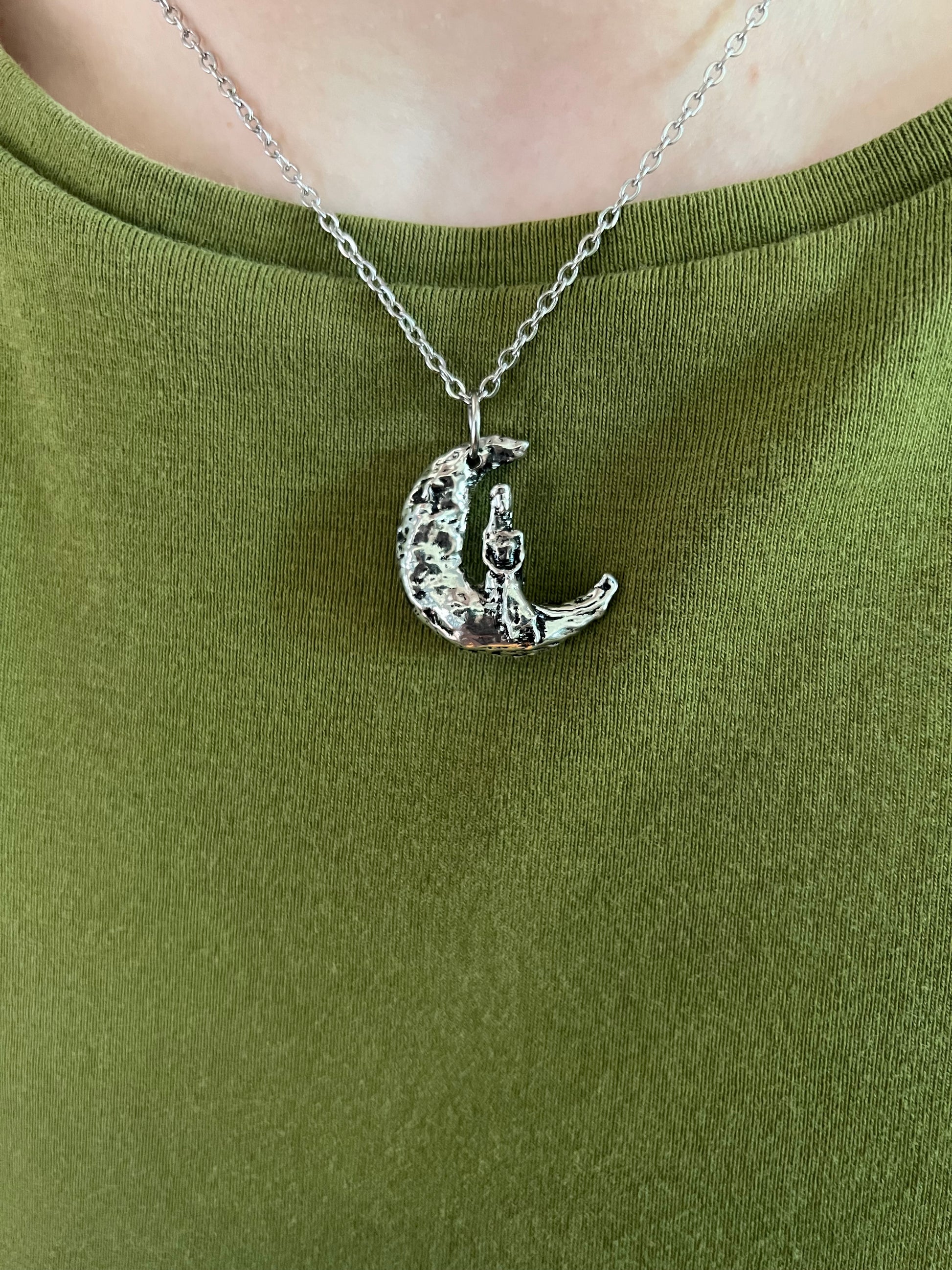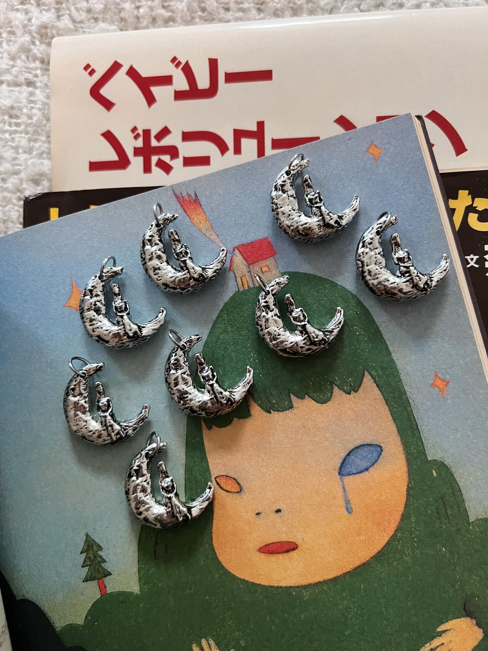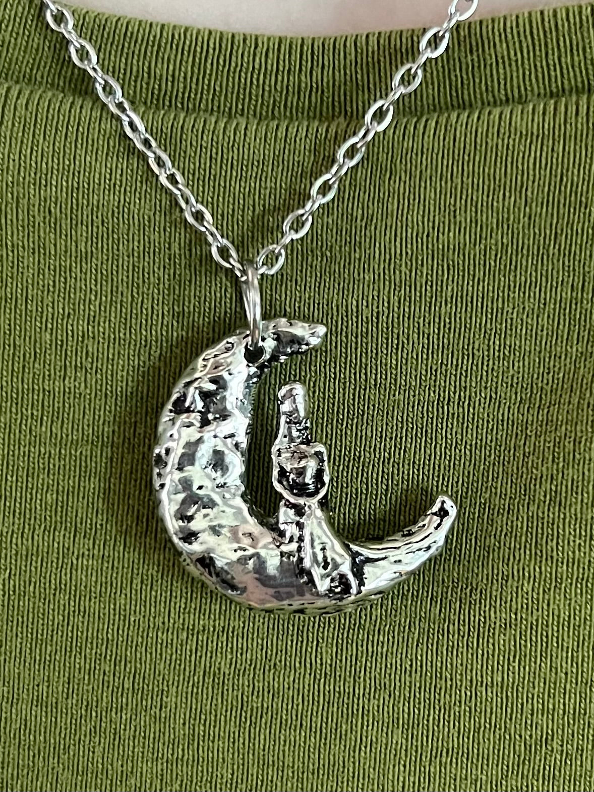 fully handmade! a girl on the moon!! the pendent is made from lead free solder and the chain is 16 inch stainless steel! the black may slight come off over time if constantly exposed to water! Due to the handmade nature your piece might have slight differences!