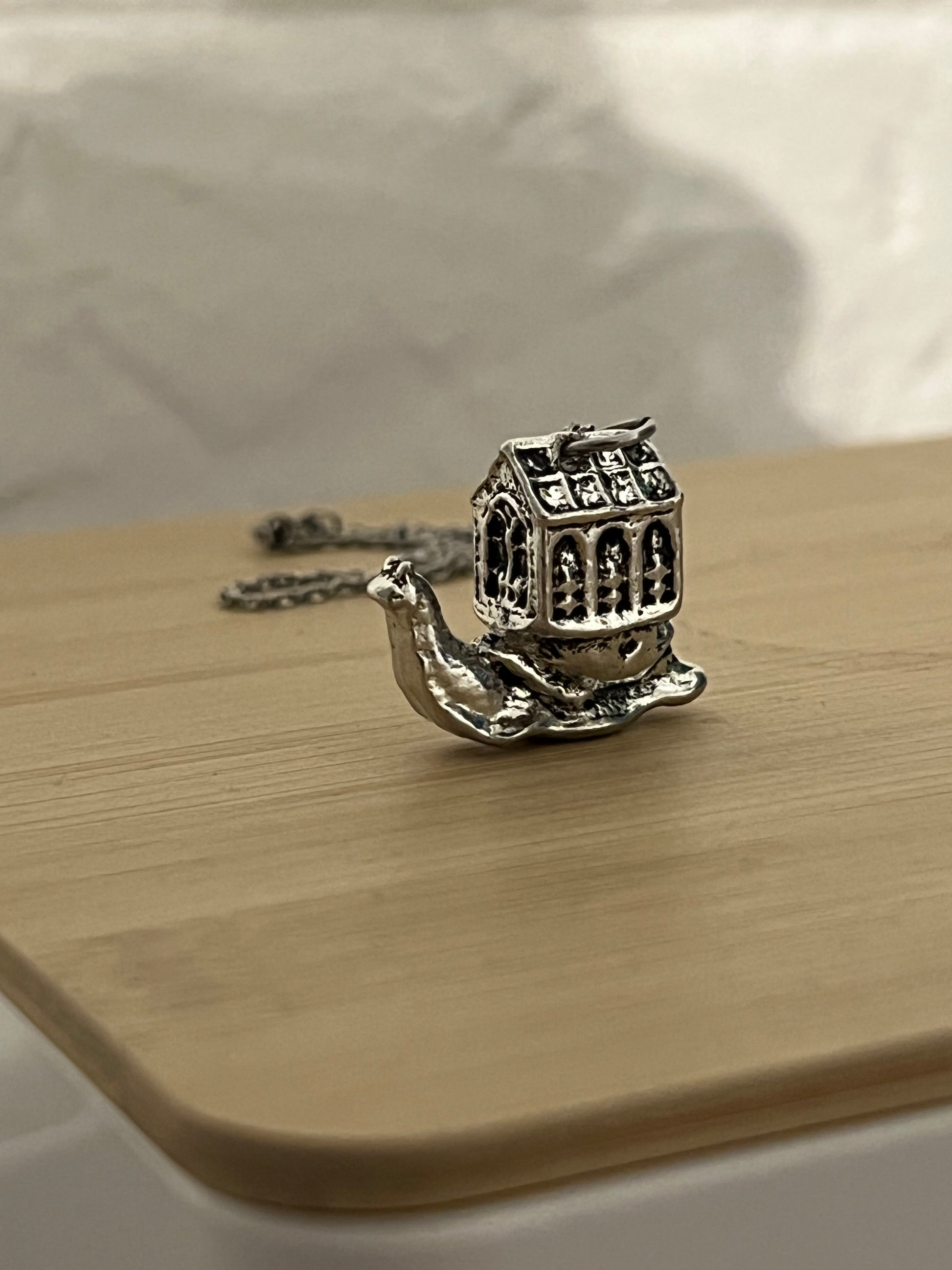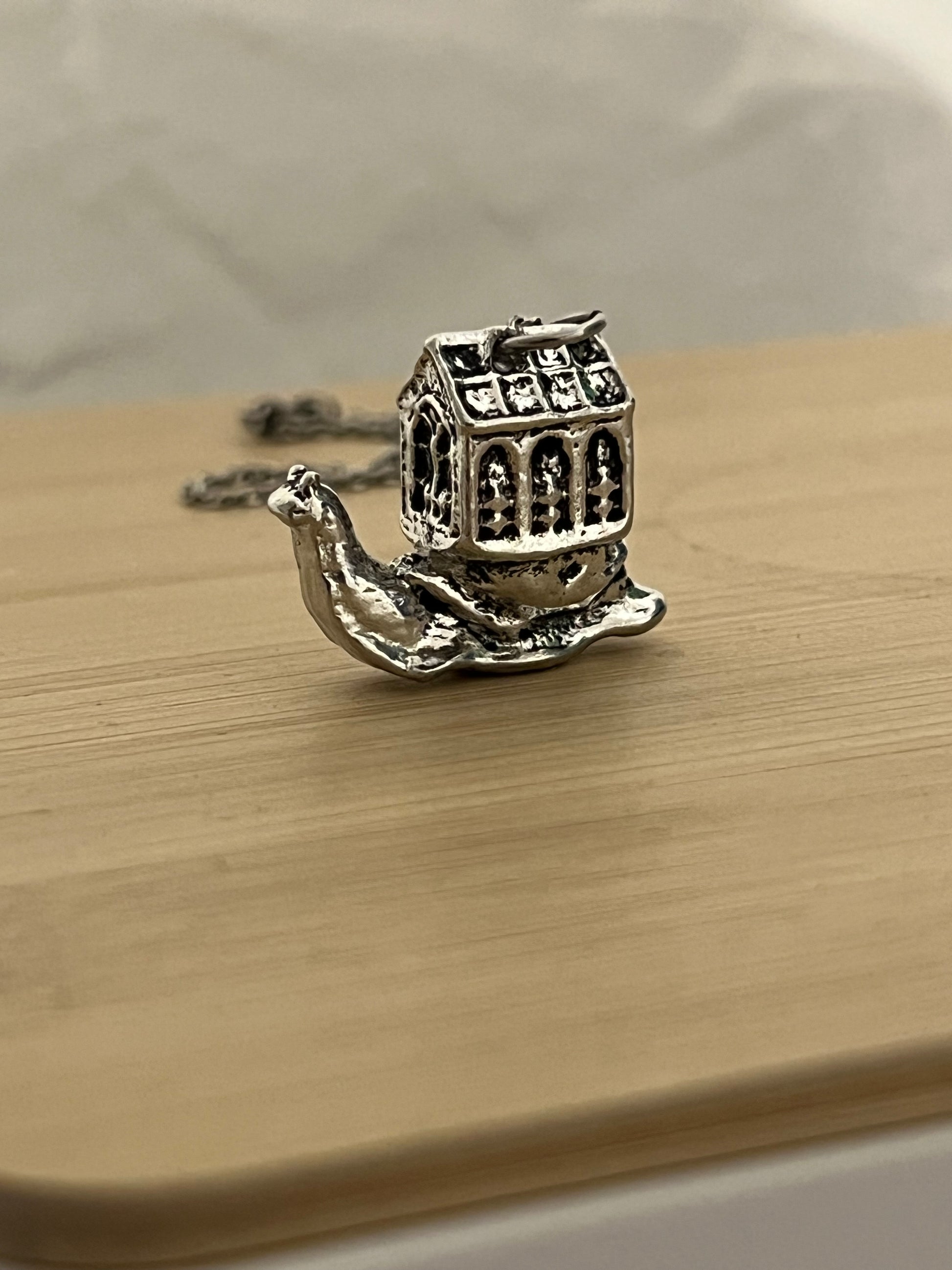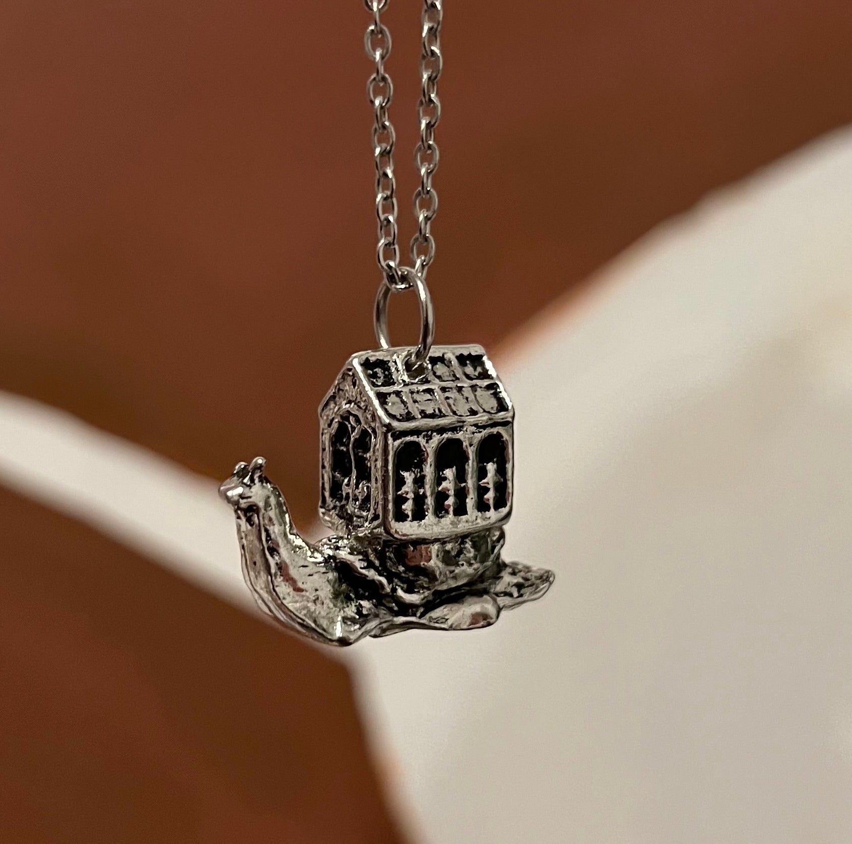 this necklace is handmade by me! It’s a cute little snail with a greenhouse on her back! It’s made from lead free pewter! Pewter last for decades without ever tarnishing!! The chain is a 16 inch stainless steel chain! Due to the handmade nature your necklace could have slight differences!