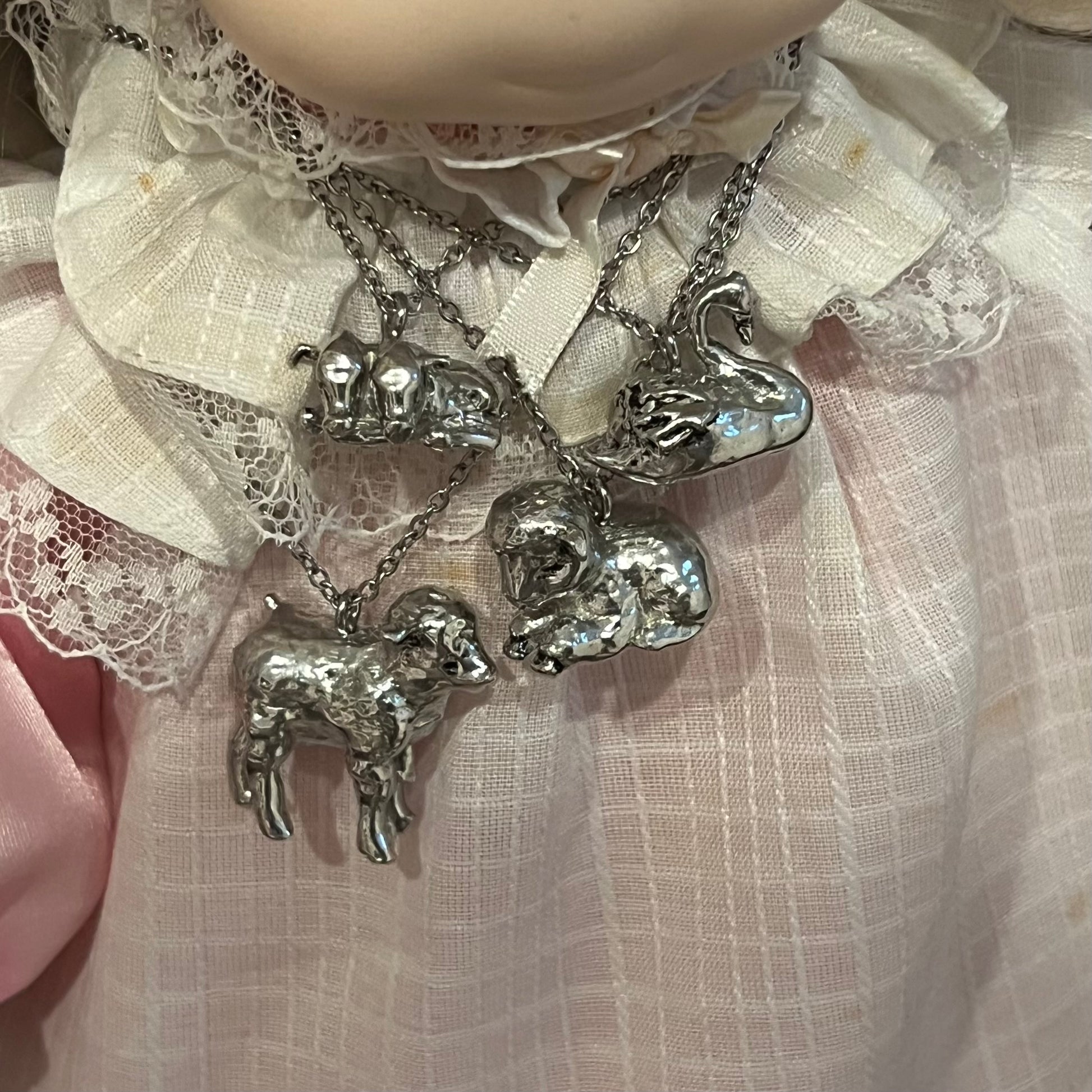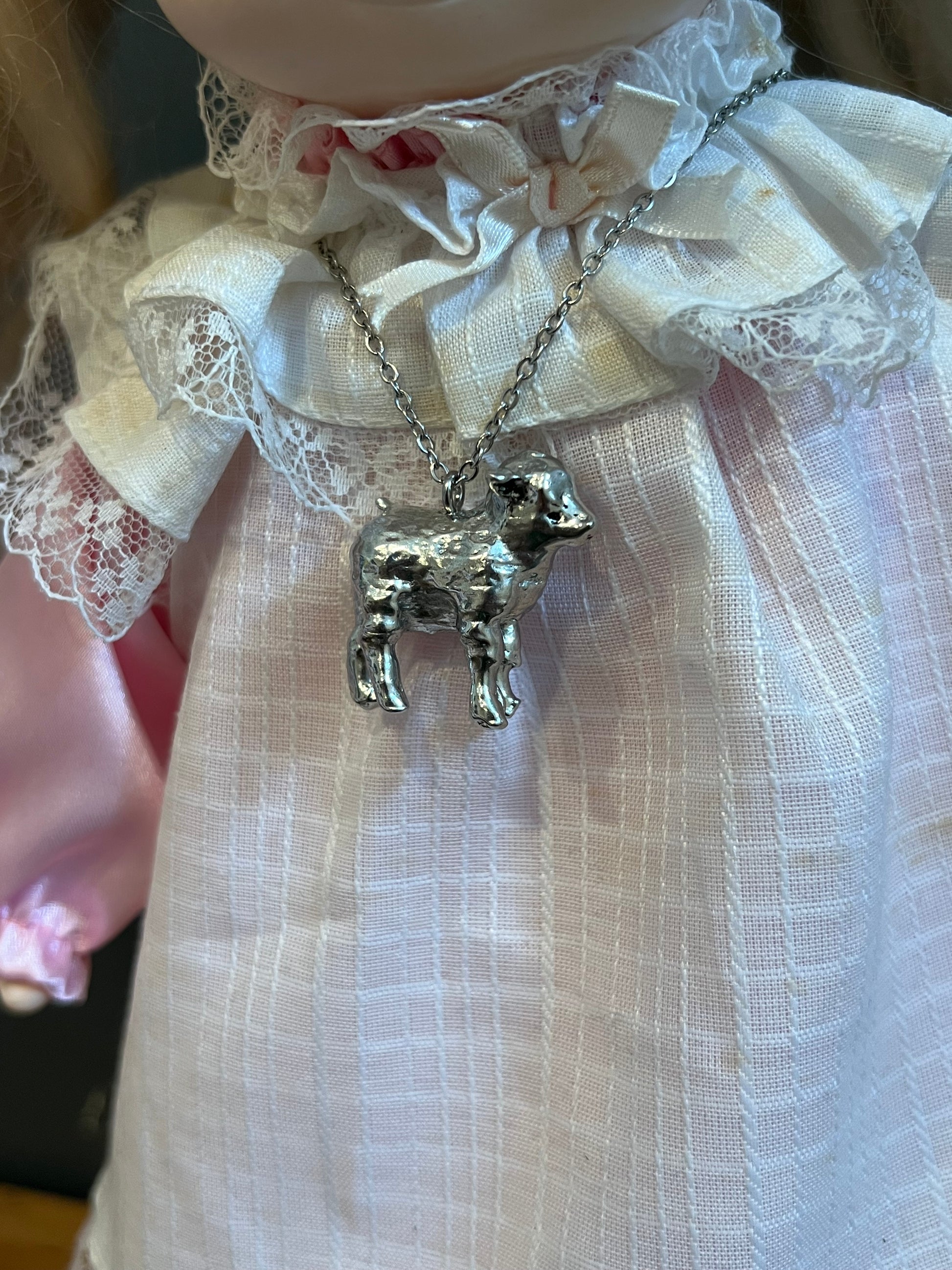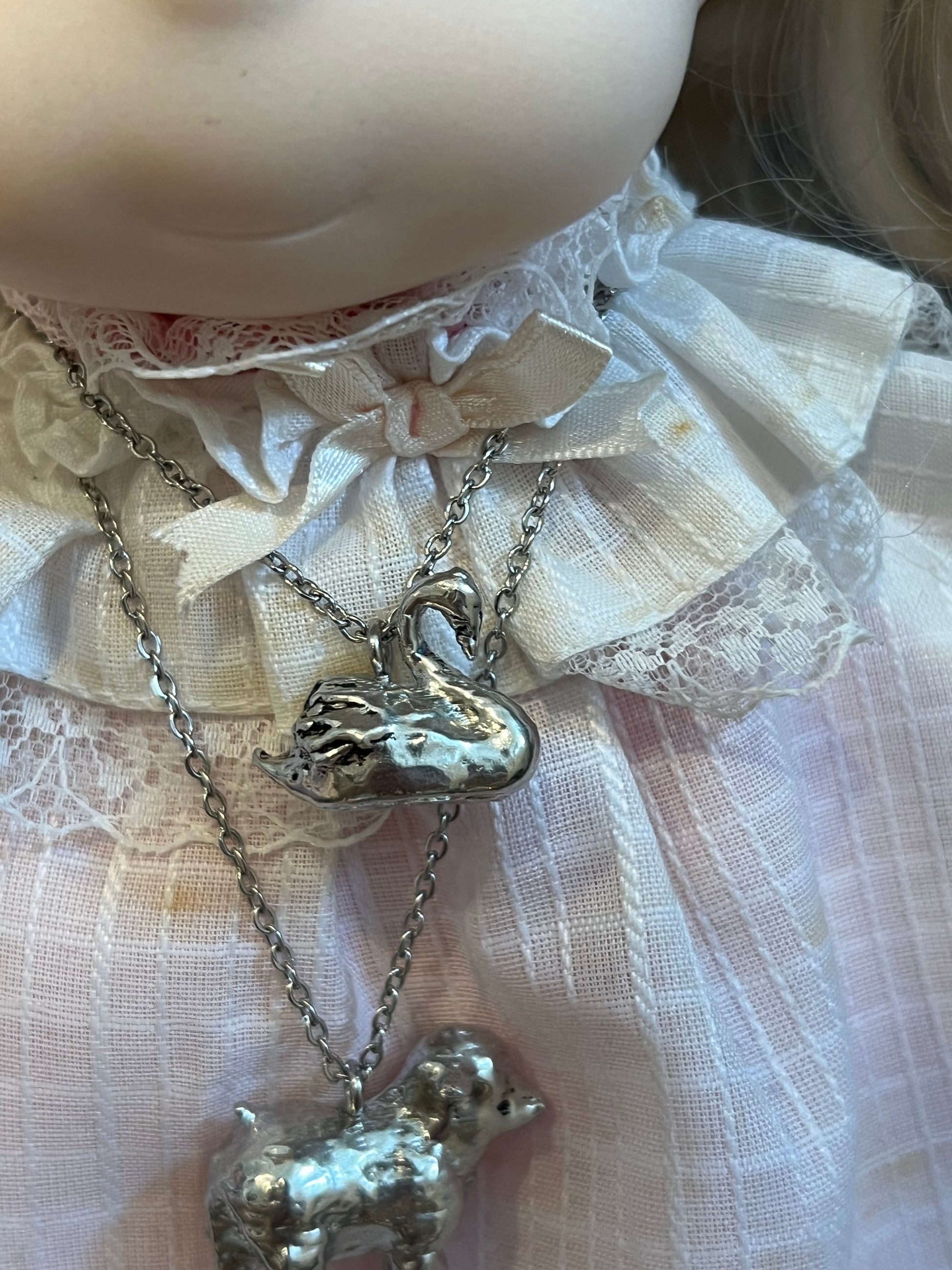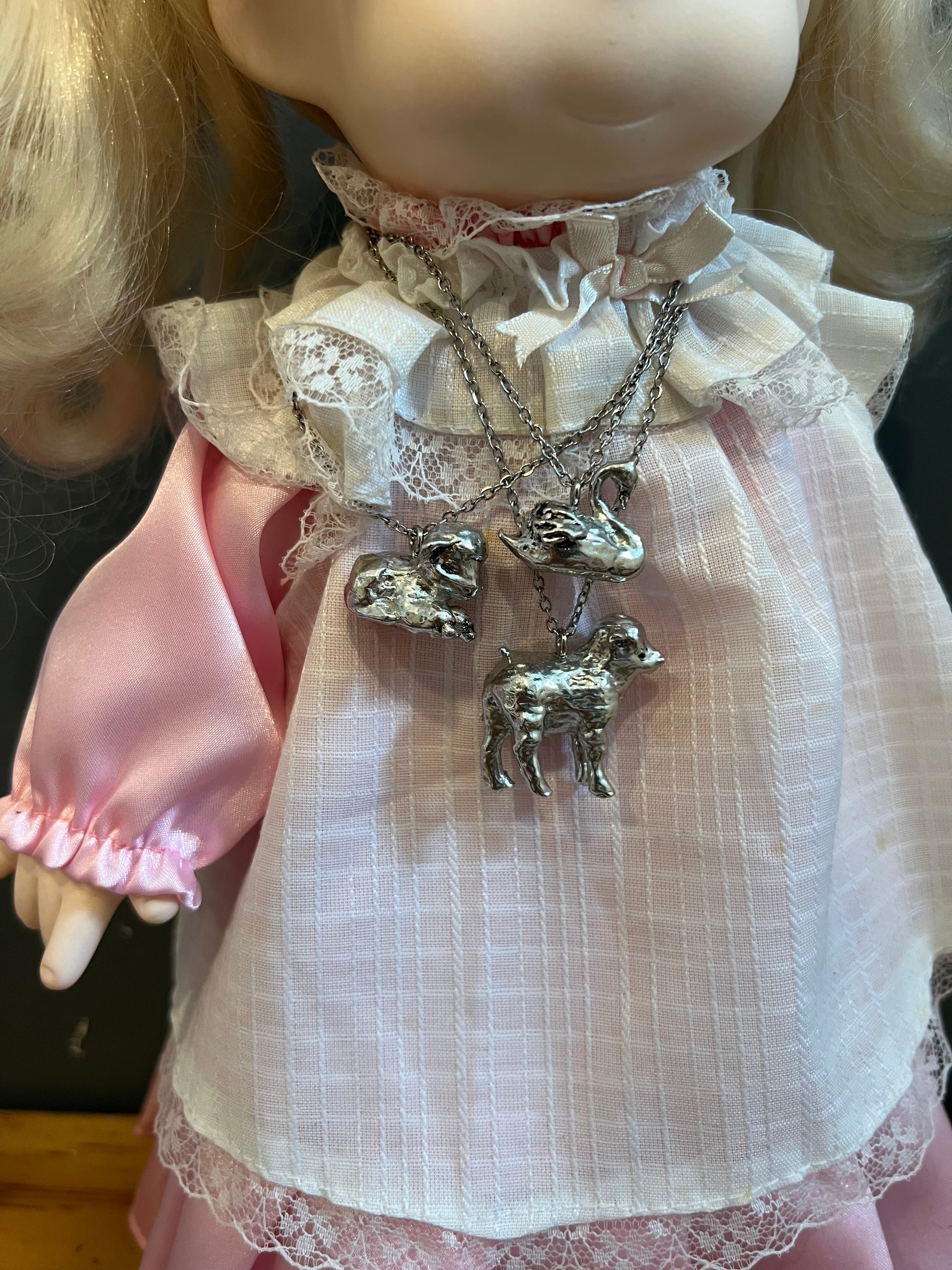 These are handmade by me! Made from pewter and stainless steel! The chain is 16 inches long.