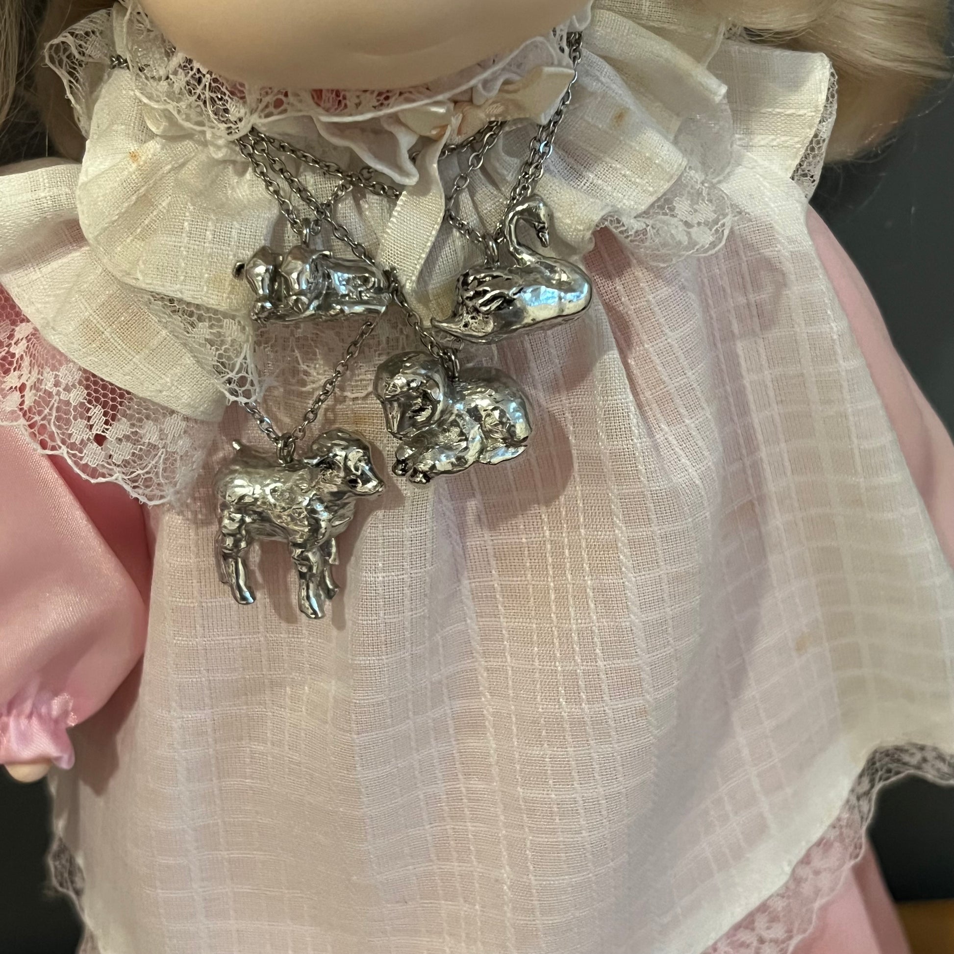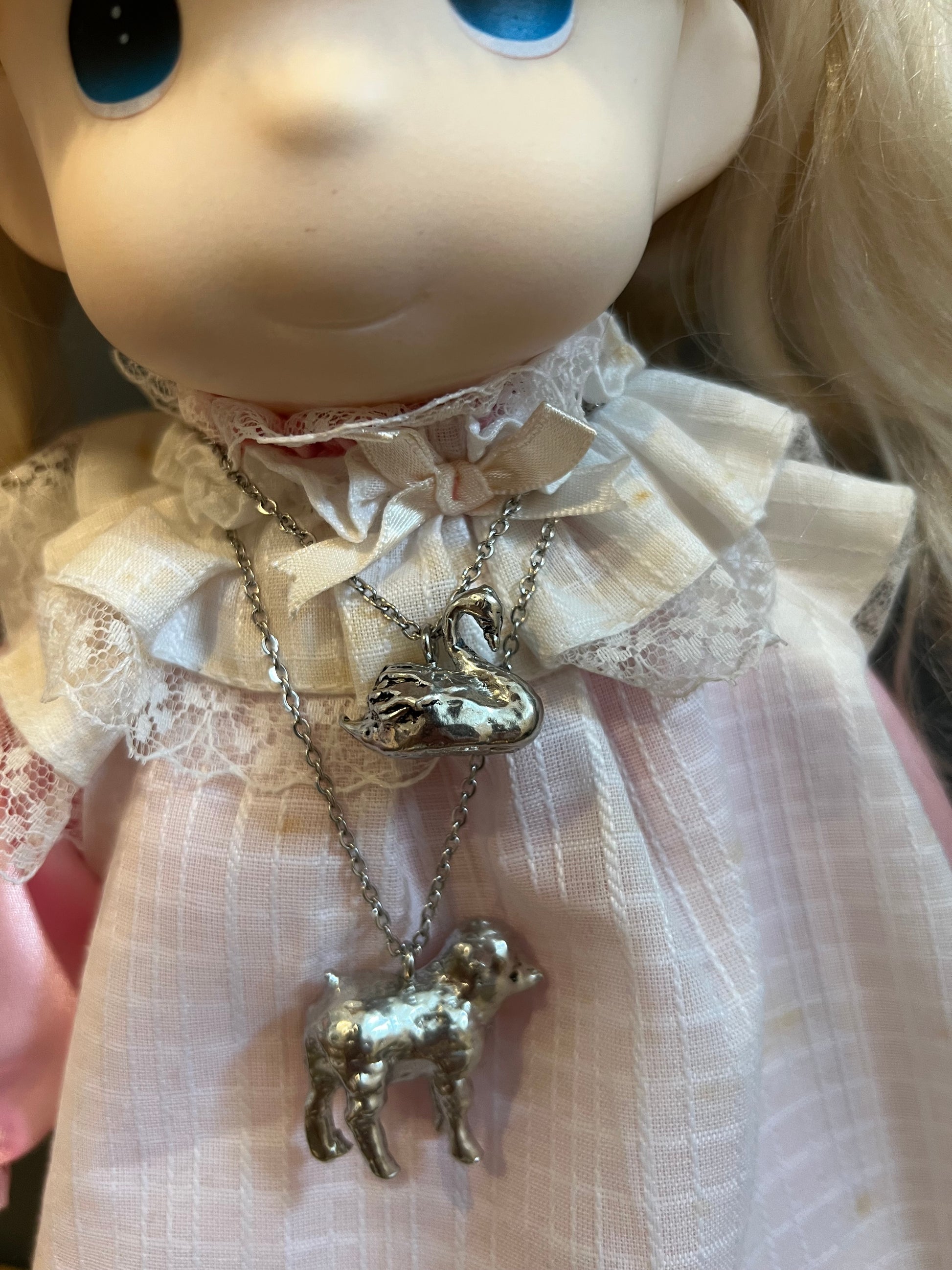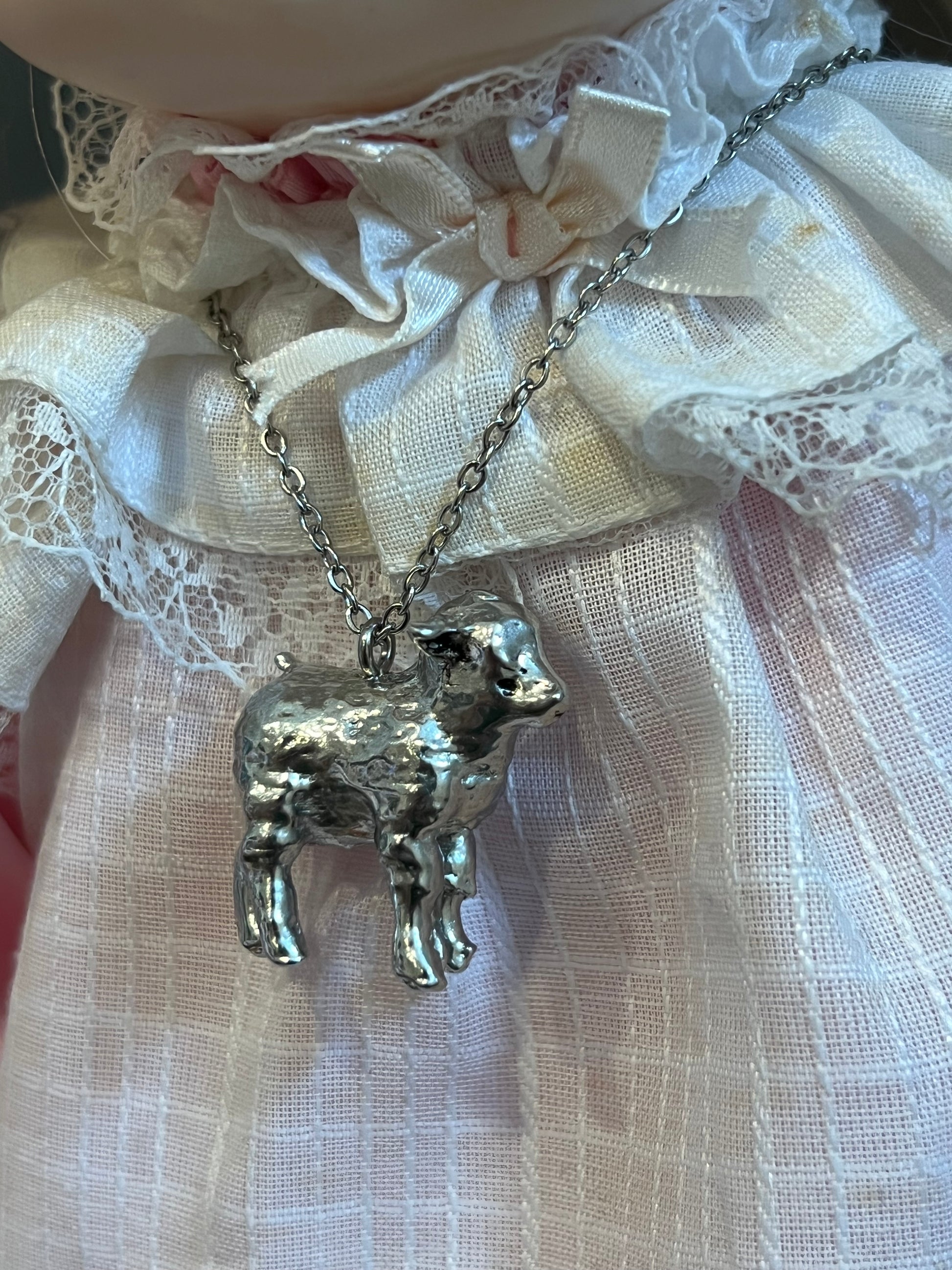 These are handmade by me! Made from pewter and stainless steel! The chain is 16 inches long.