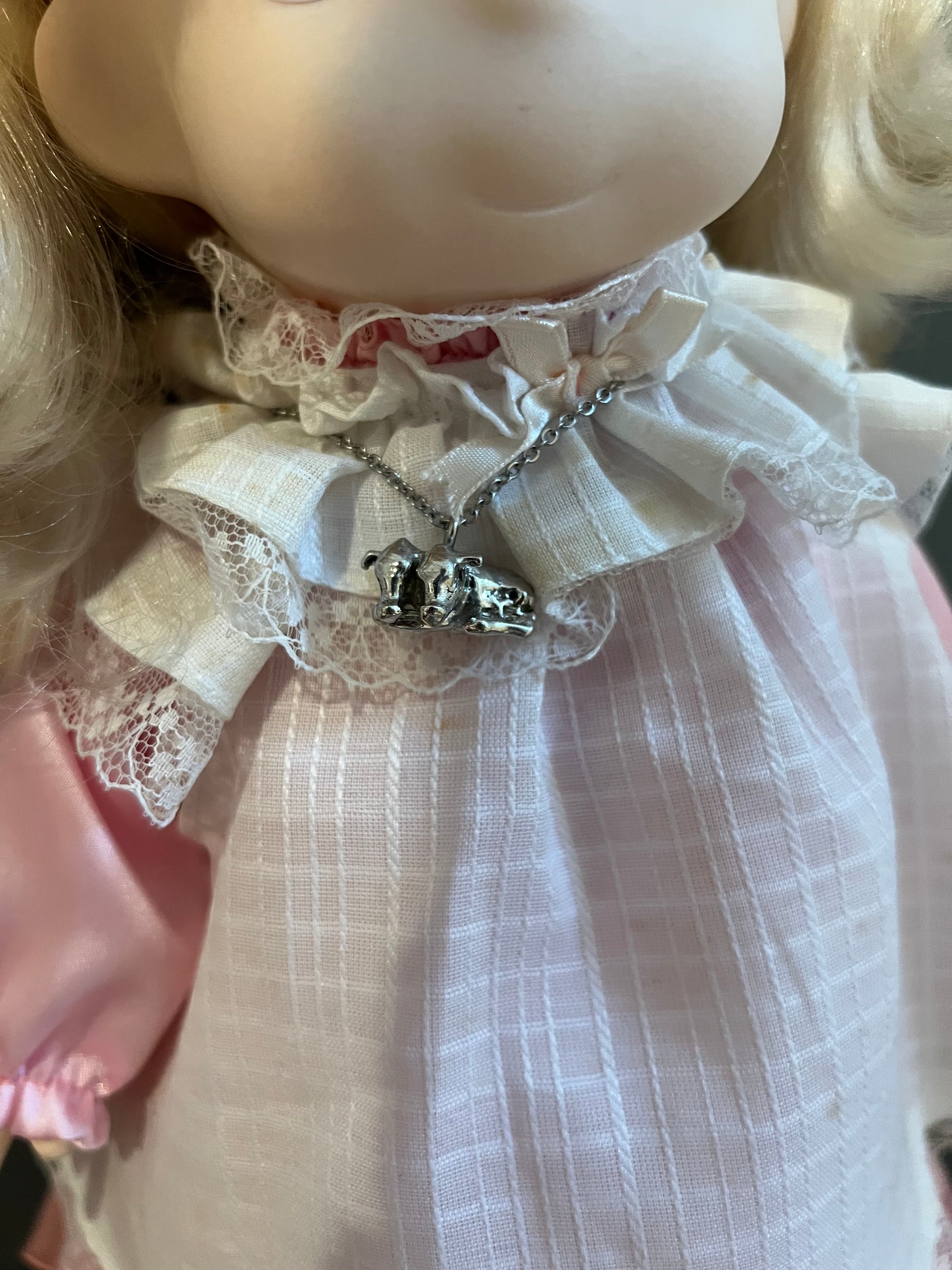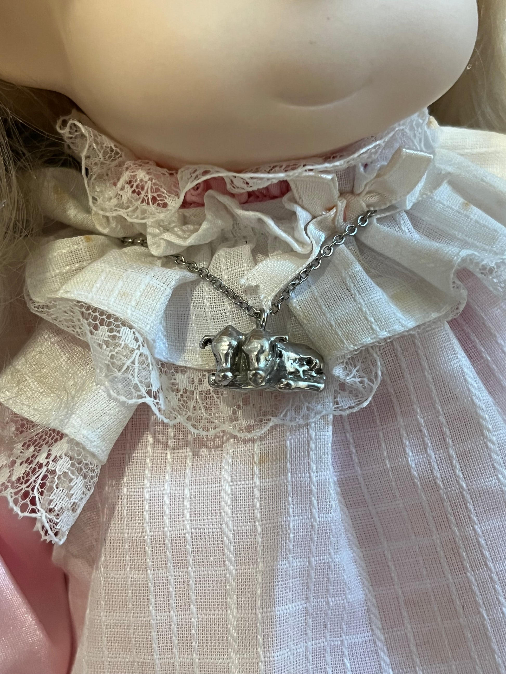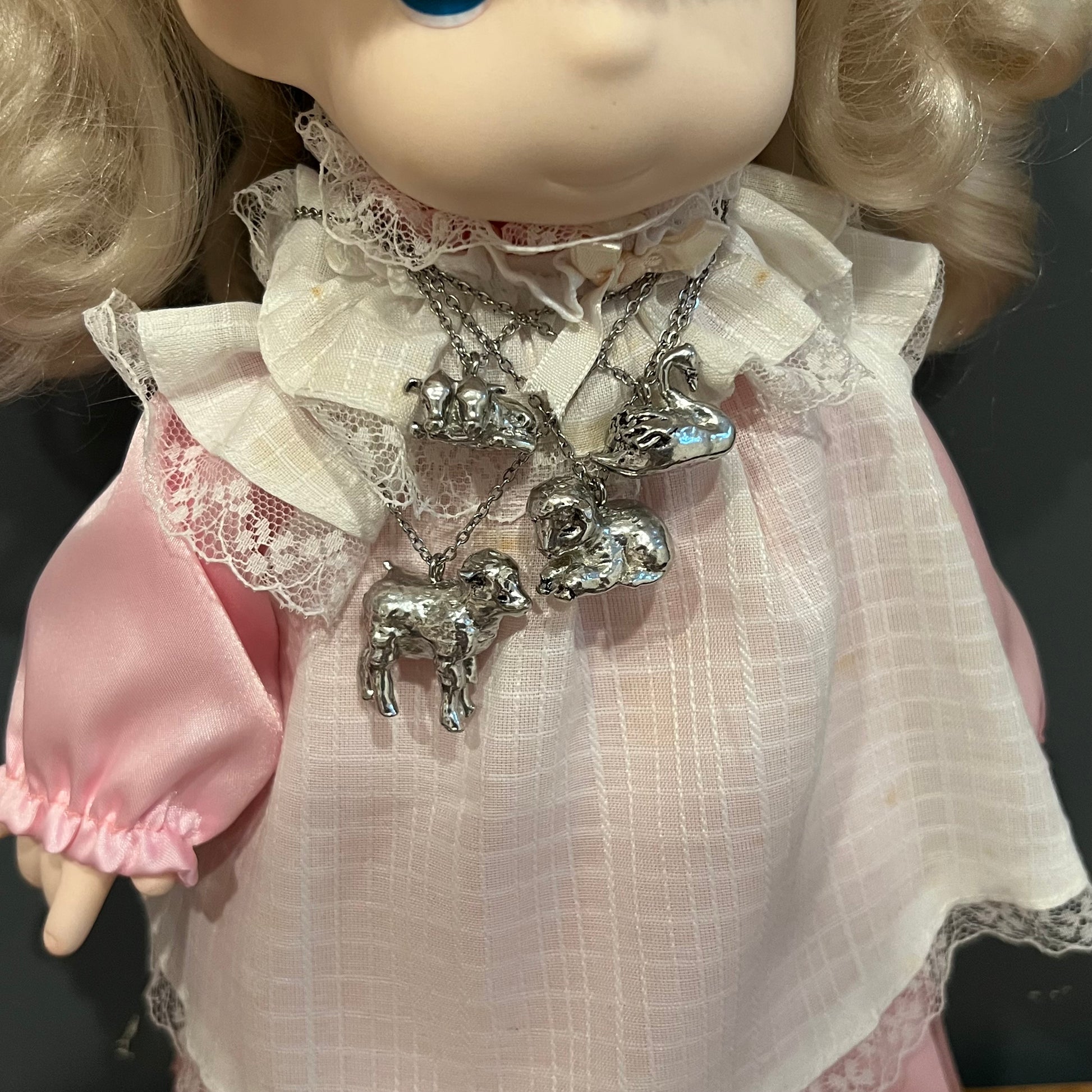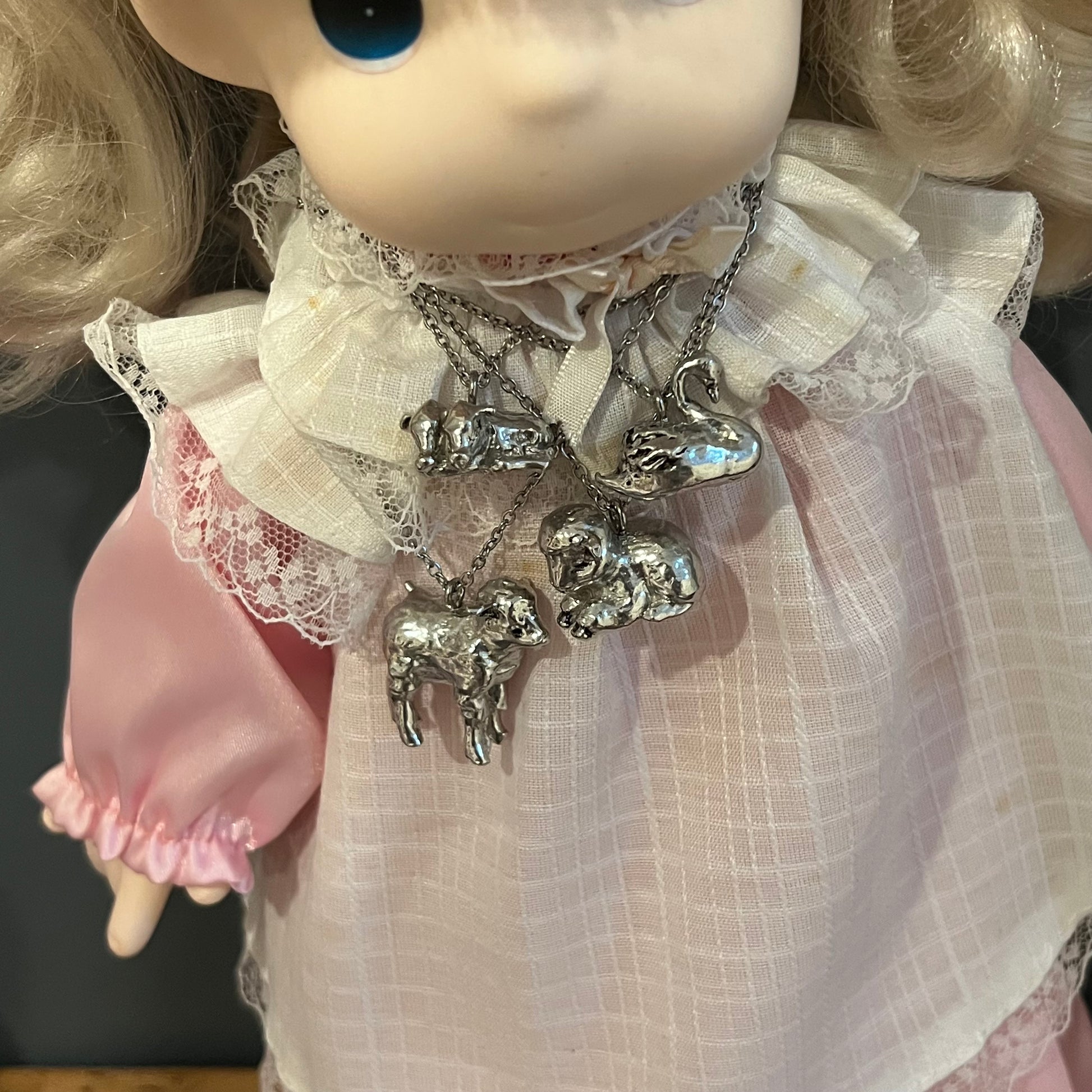 These are handmade by me! Made from pewter and stainless steel! The chain is 16 inches long.
