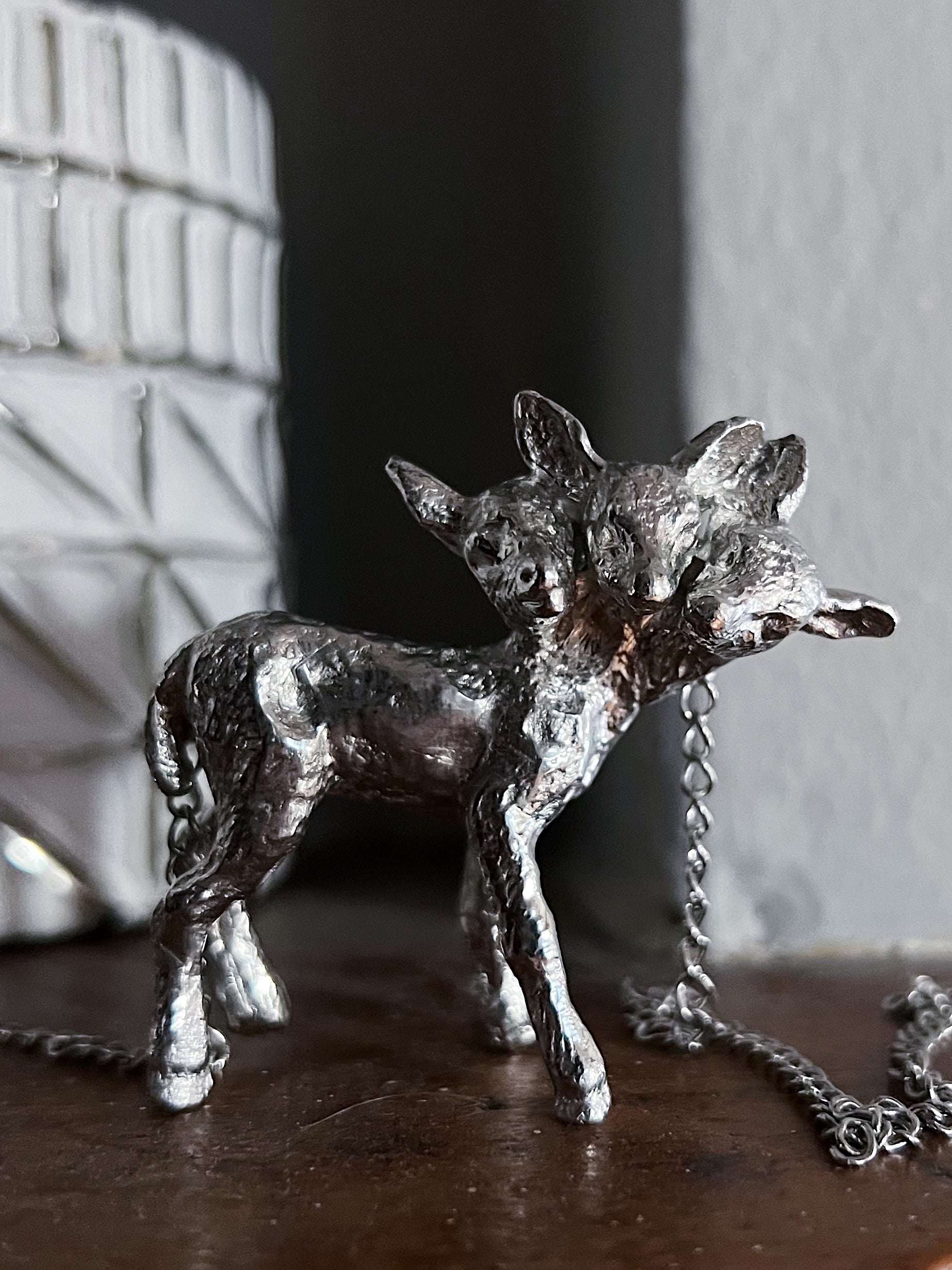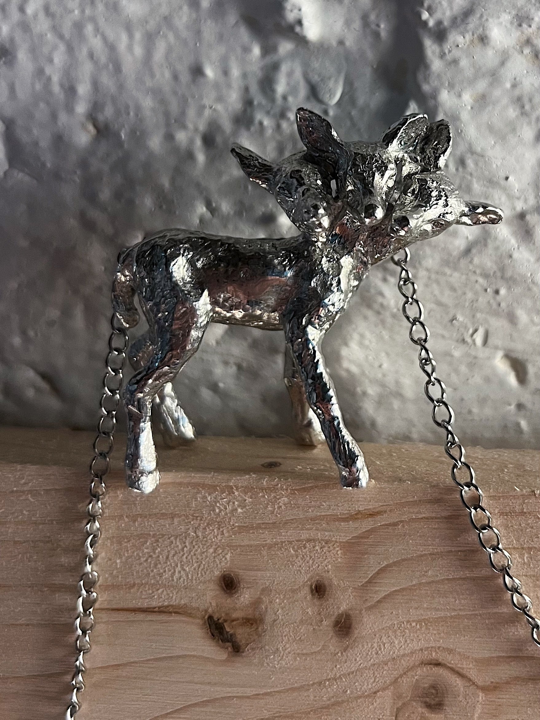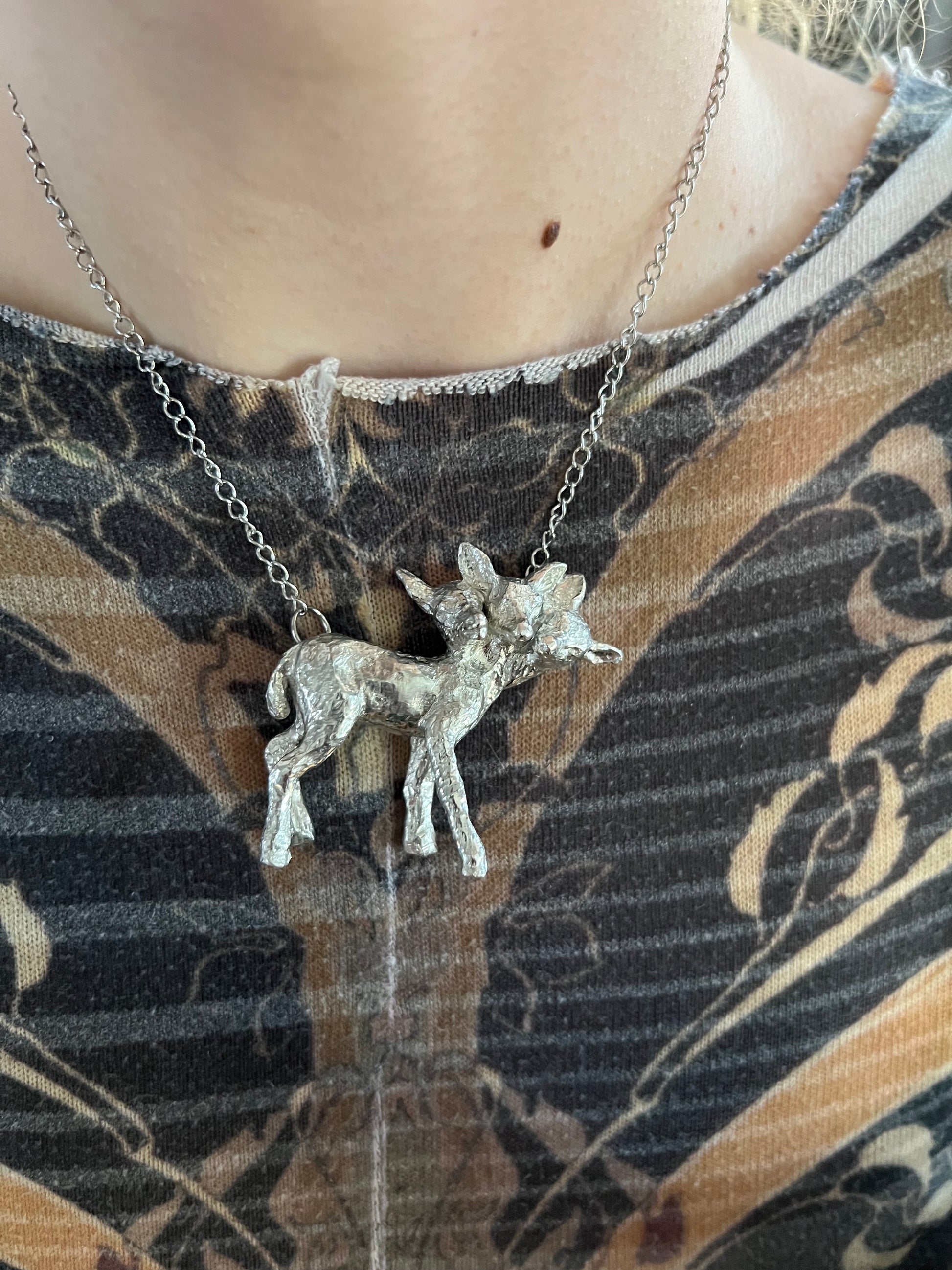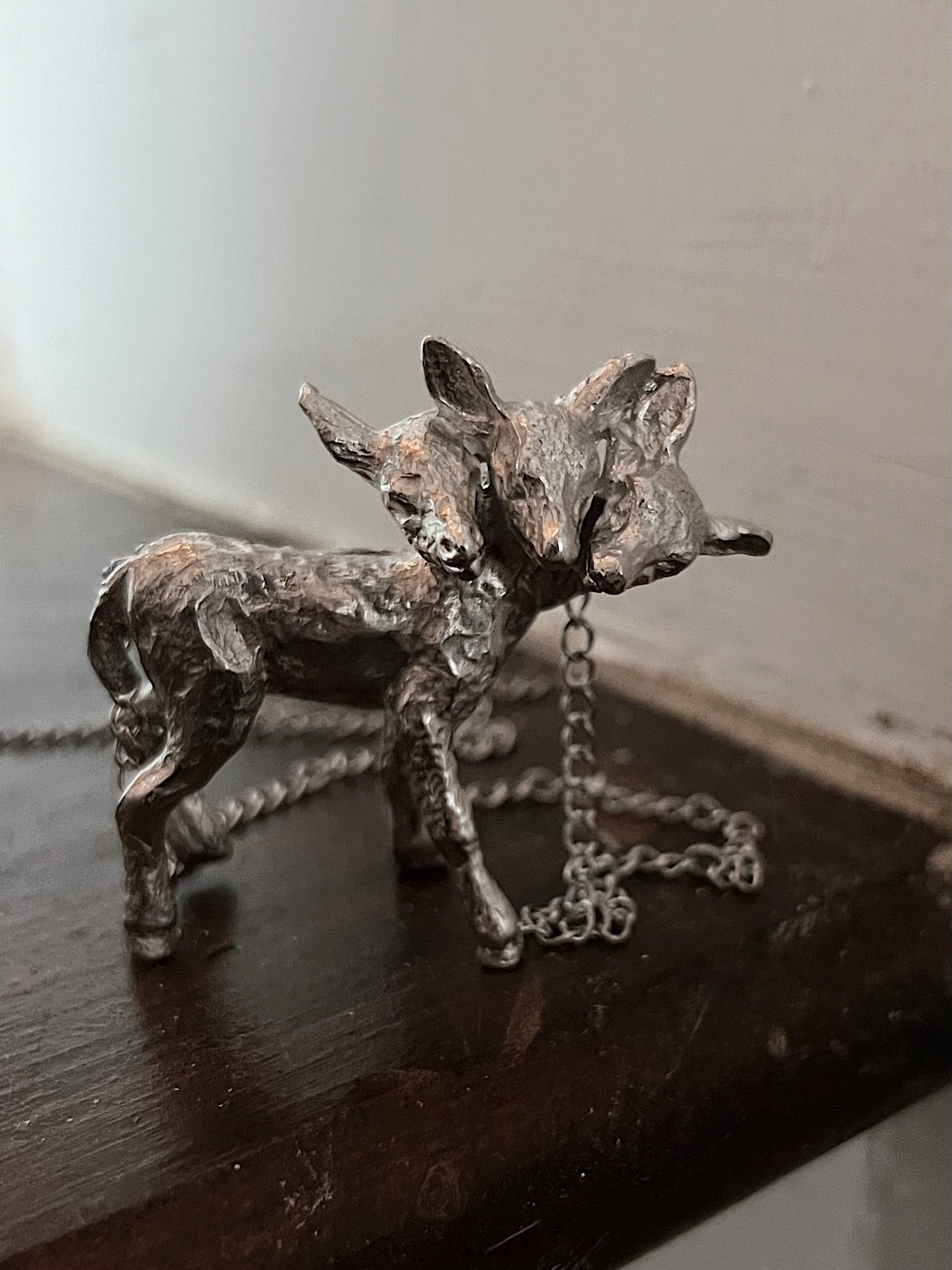 This necklace is handmade by me! It’s a three headed deer made from lead free pewter! It will not tarnish! The chain is 16 inches and stainless steel!