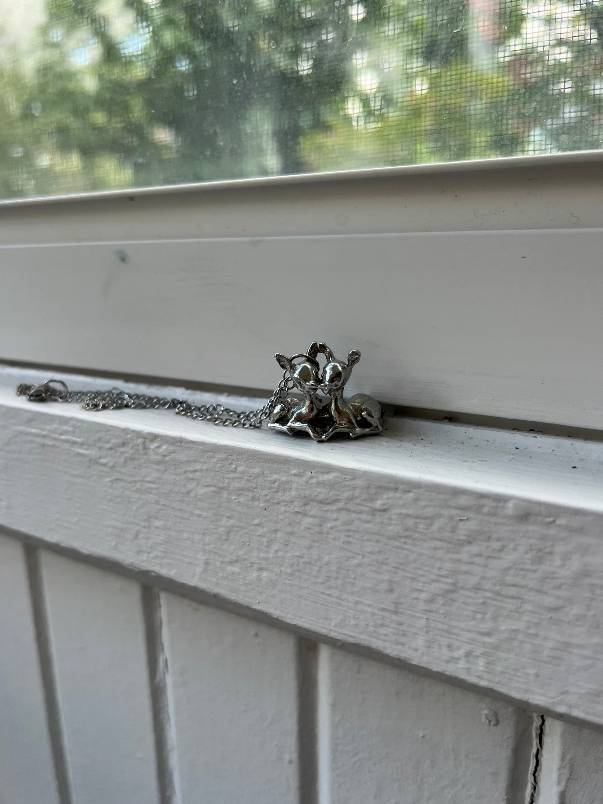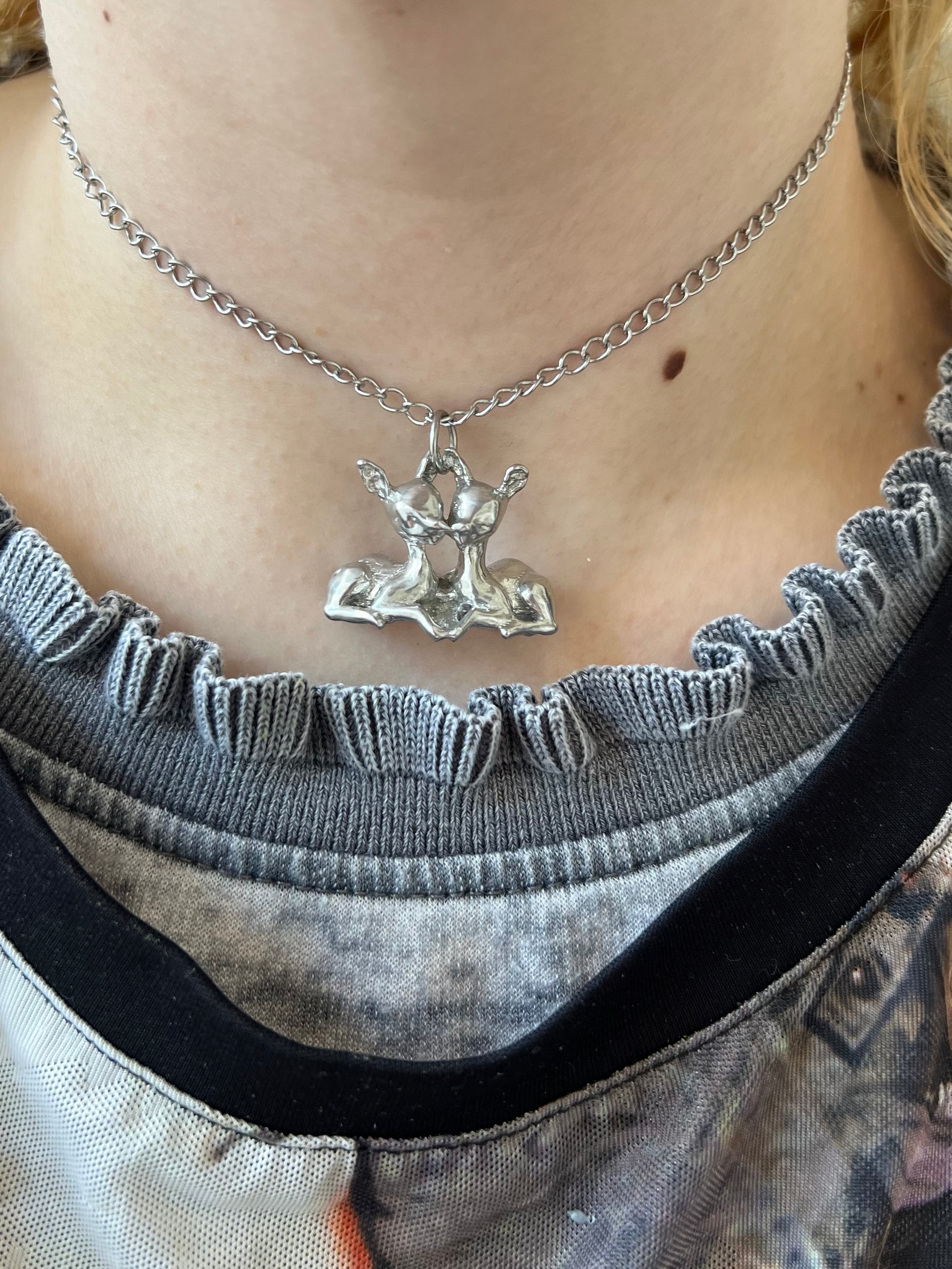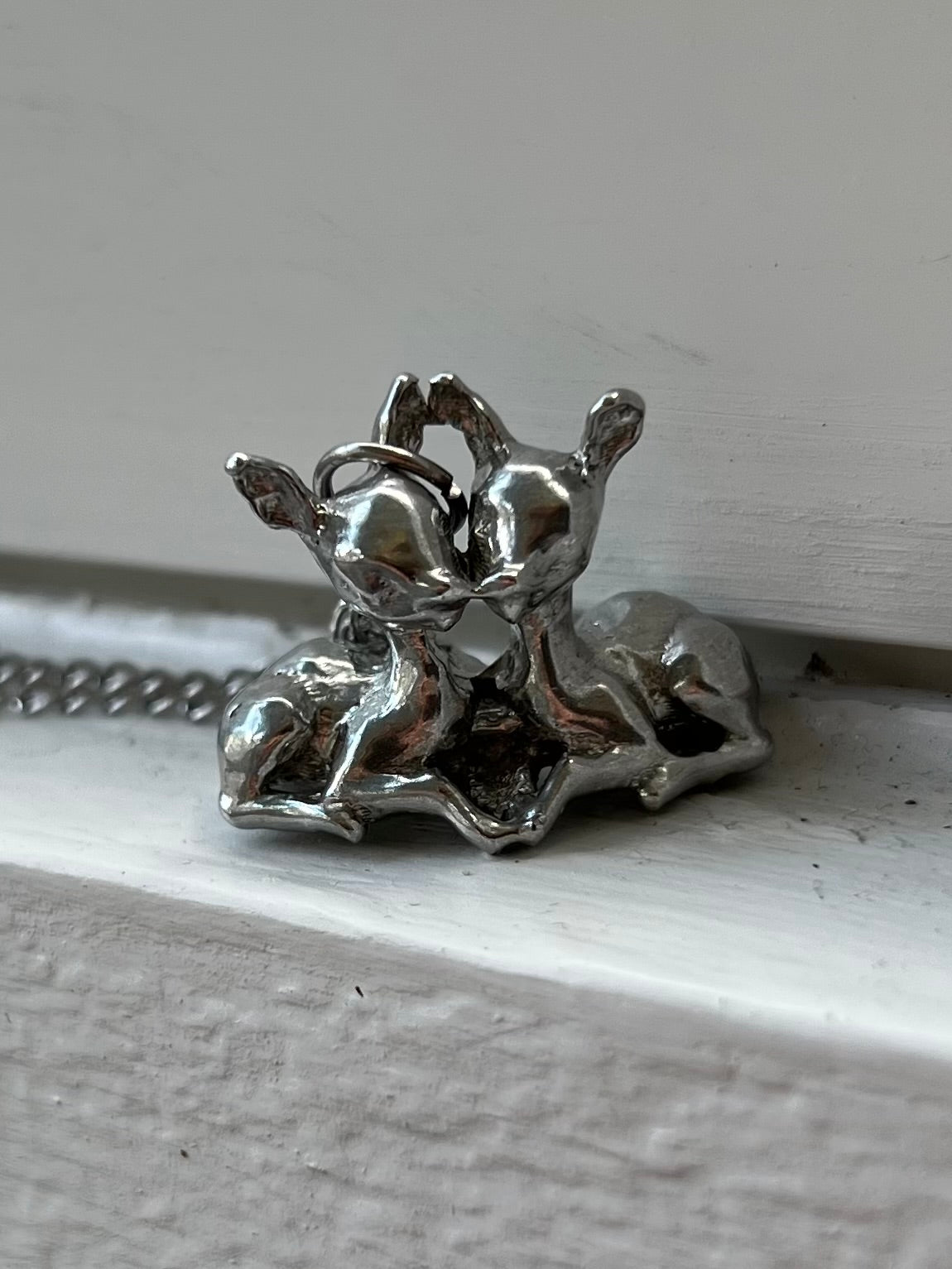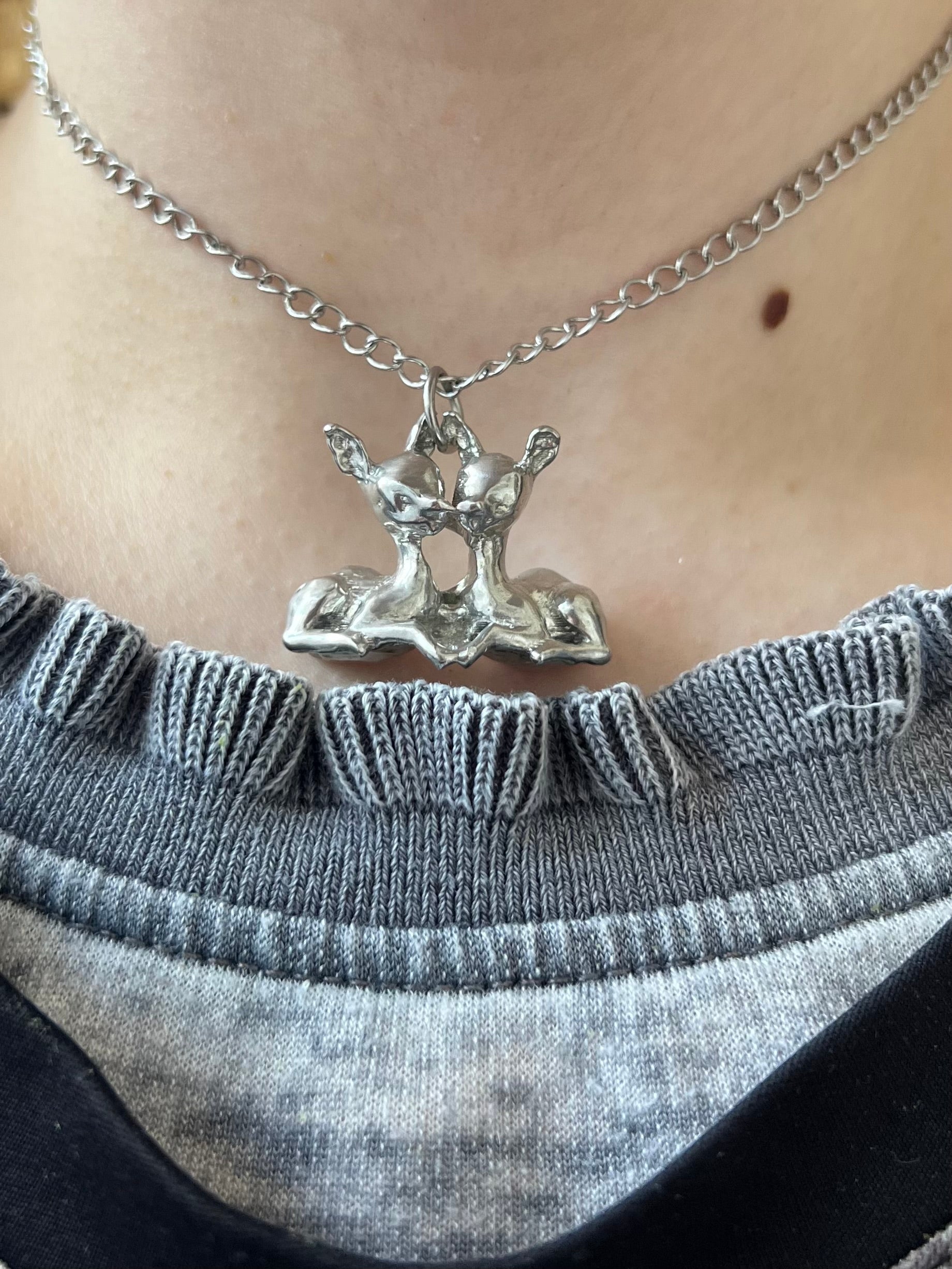 two fawns kissing! handmade from pewter!! the chain is stainless steel and 16 inches!