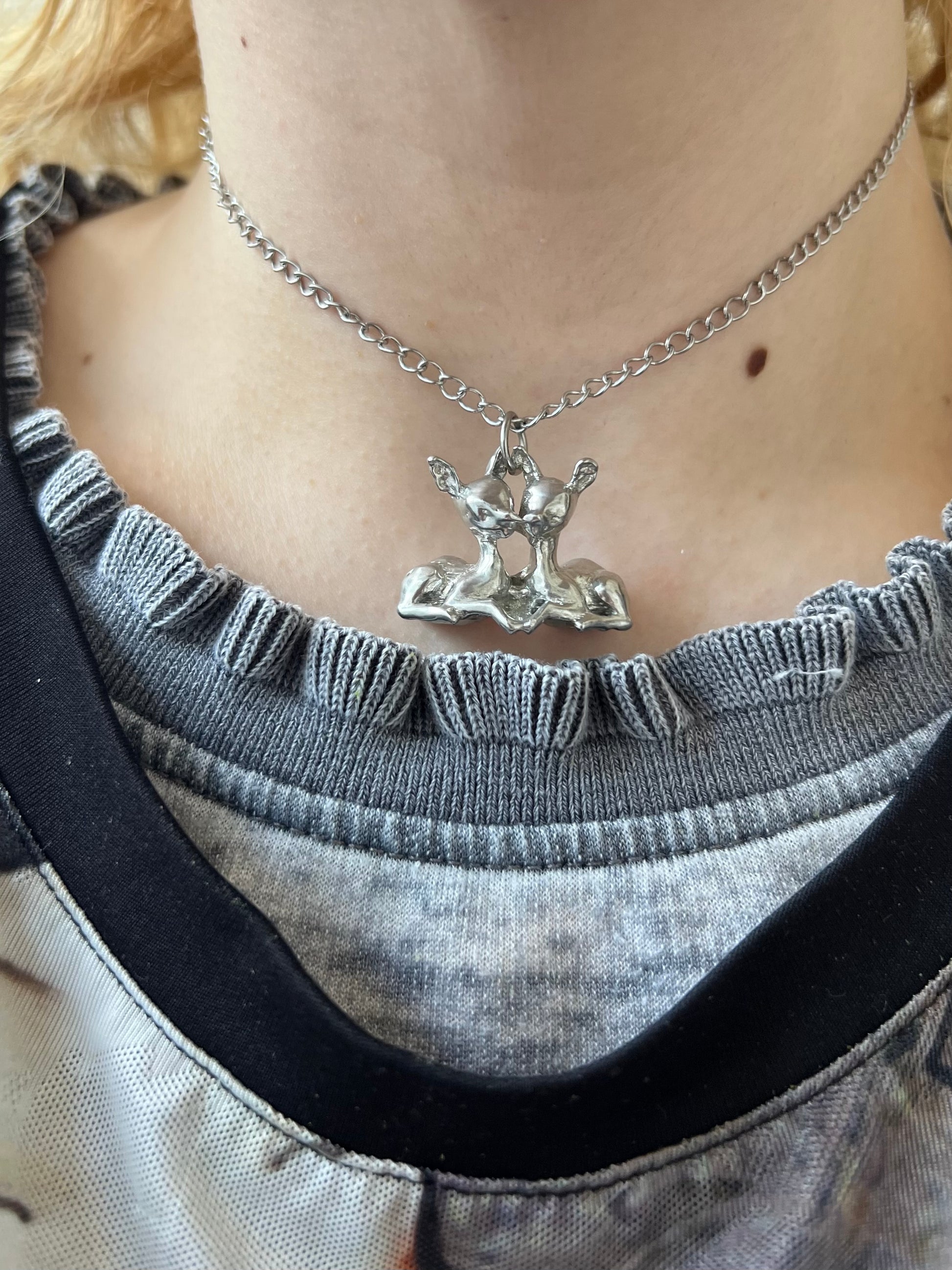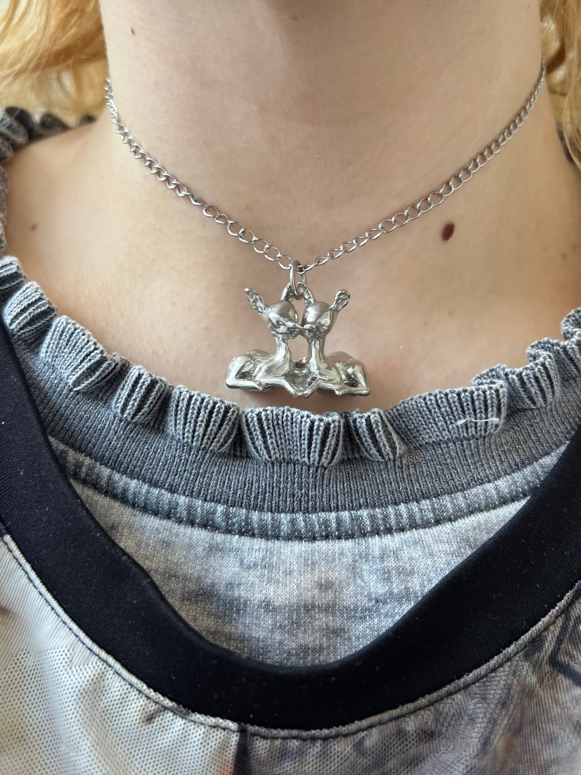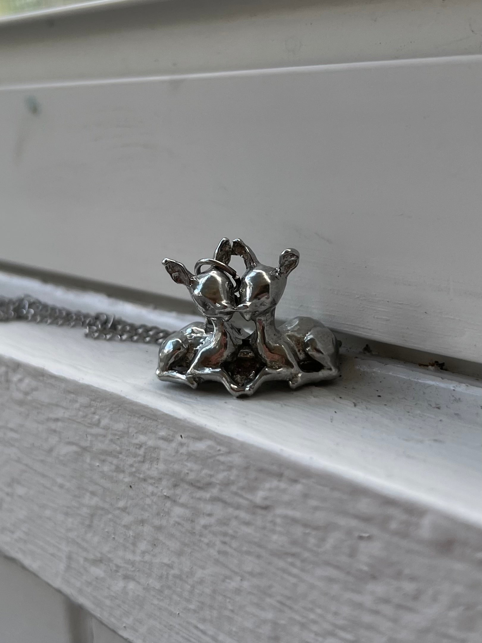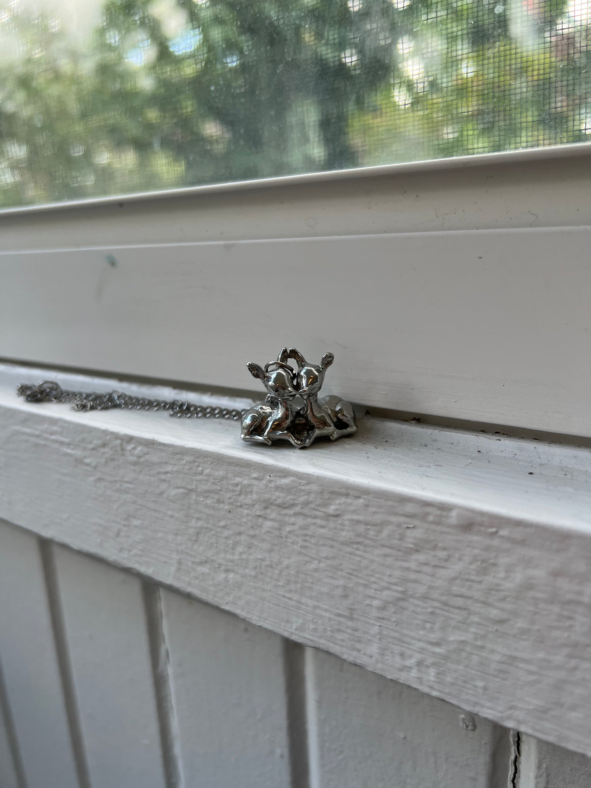 two fawns kissing! handmade from pewter!! the chain is stainless steel and 16 inches!